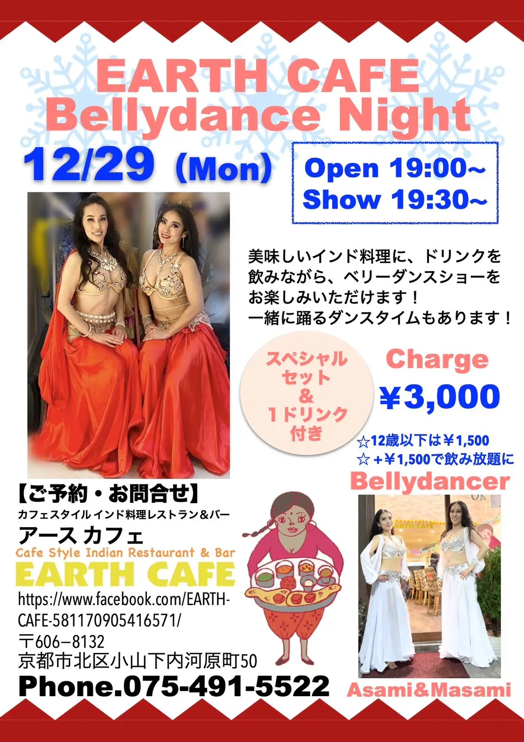 | 内容: | 美味しいインド料理に、ドリンクを飲みながら、ベリーダンスショーをお楽しみいただけます!もちろん、大好評の一緒に踊るダンスタイムもあります! |
